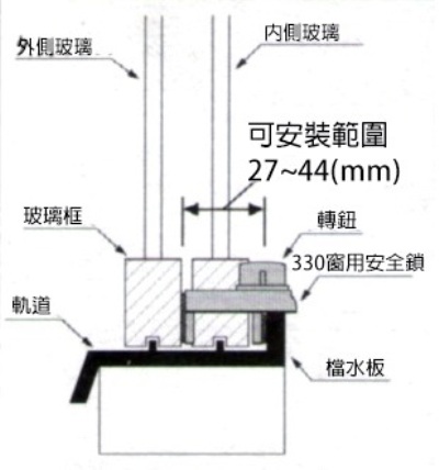 (鎖上以後, 前面一片窗戶限制開口, 後面一片窗戶無法移動。)
